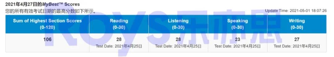 Roys樂亦思托福課程學(xué)員實(shí)現(xiàn)78到106的突破
