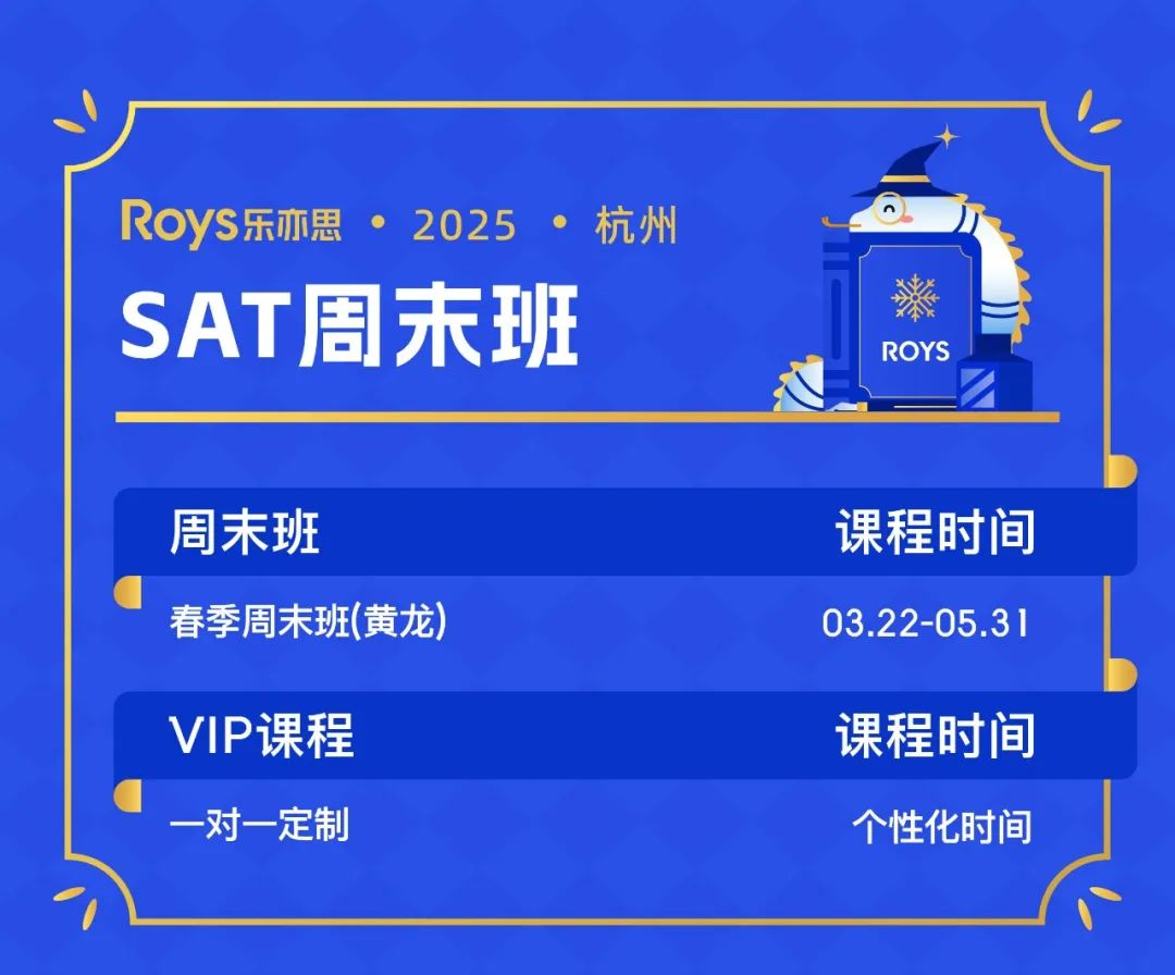 為此,我們精心籌備了2025年春季SAT課程,班型設(shè)置包括:SAT周末班、SAT考前??及?,以及VIP一對(duì)一定制課程,滿足不同基礎(chǔ)學(xué)員的個(gè)性化學(xué)習(xí)需求。
