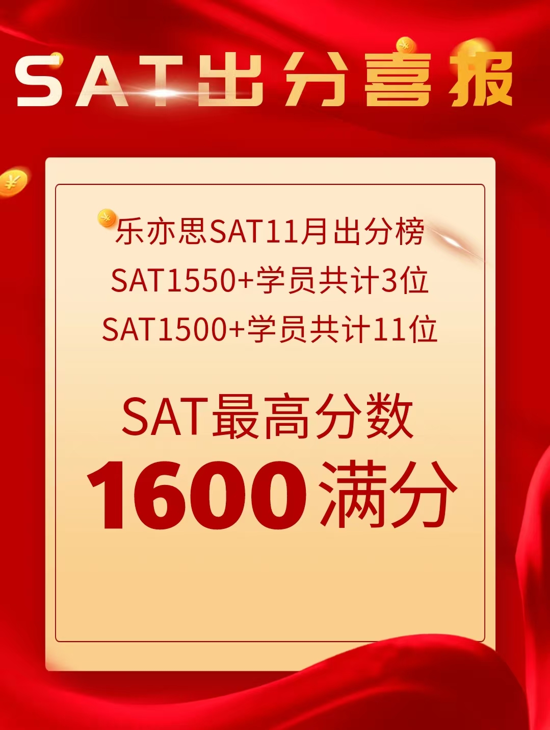 在剛剛結束的11月SAT考試中,樂亦思的學員們再次展現了非凡的實力,強勢出分,成績斐然!截至11月22日18:00,我們得知,有學員斬獲了SAT滿分的成績——1600分,這也是對他們辛勤付出的最好回報。